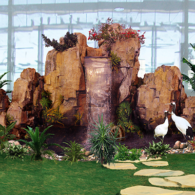 2、粘合膠接假山:膠接山體,第 一步,先要調好水泥膠漿,注意膠漿要隨用隨調,還要注意膠漿的稀稠度。第二步,石材加工,把需要膠接的山體用錘、鑿、鋸等工具加工出紋理和比較奇特的形狀來。第三步,粘合山體,在需要粘合的山石兩麵用嵌板分別塗上水泥膠漿使山石吻合為一體,粘合時要注意,盡量使山石粘合處看不出斷裂的痕跡,還要注意把粘合處多餘的膠漿清除幹淨。